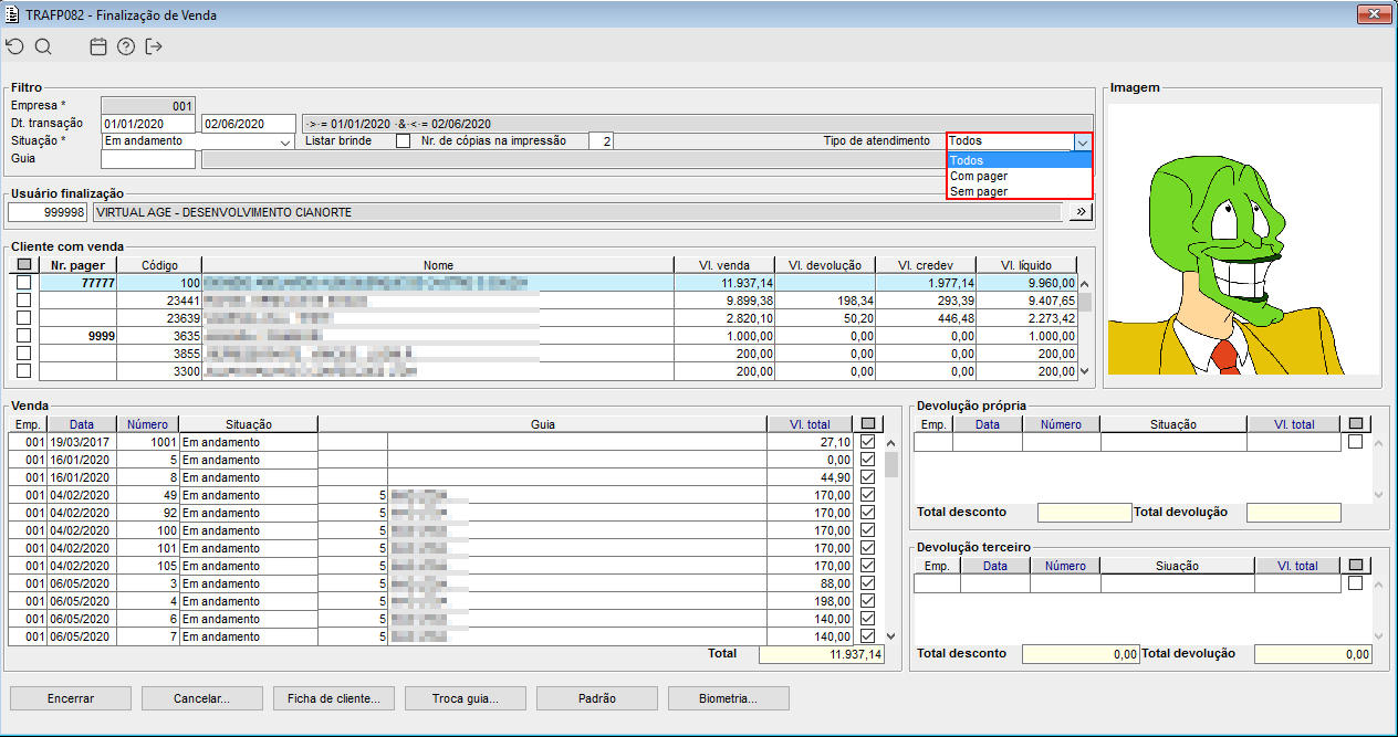 Imagem 01 - Demonstra o componente TRAFP082 onde é possível selecionar o "Tipo de atendimento" podendo filtrar entre: Todos, Com pager e Sem pager, sendo assim ao selecionar a opção desejada e realizar a consulta será apresentado no frame "Cliente com venda" de acordo com a sua preferencia, exemplo ao selecionar "Com pager" serão filtradas apenas as vendas que possuem um pager vinculado a ela. Caso selecione "Todos", serão apresentadas todas as vendas, tanto com pager quanto sem pager. Se selecionar "Sem pager" será apresentado apenas as vendas que não possuem um pager vinculado ao mesmo.