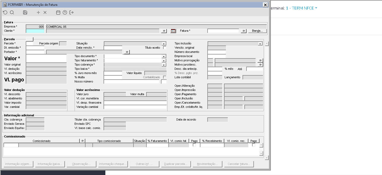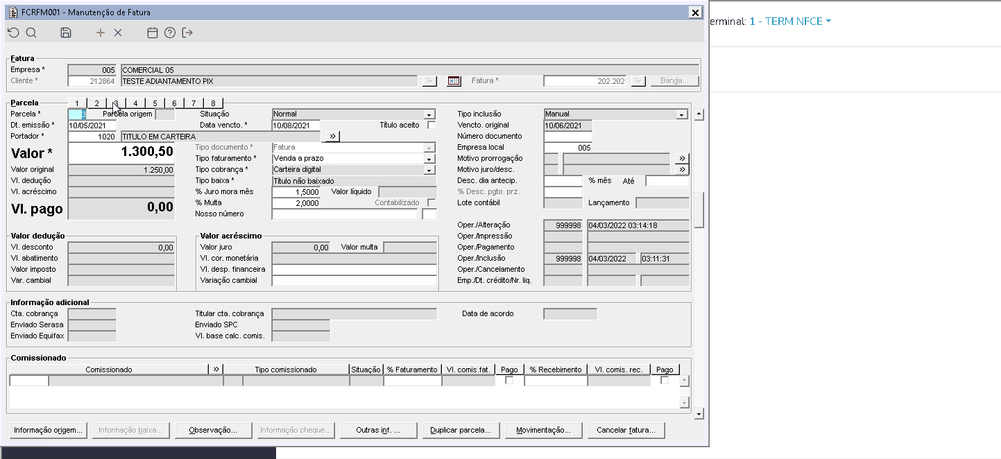 Imagem 4 - Após a geração do PIX as faturas passarão a ficar com o tipo de cobrança como "Carteira Digital" para indicar que para estes títulos foi gerado um PIX ou PICPAY. Desta forma elas não mais constarão para serem recebidas no FCRFP002, podendo ser efetuado o pagamento e assim será baixado as faturas, ou no caso de não houver e expirar o prazo de pagamento, a fatura voltará a ficar com o tipo de cobrança como "Não está em cobrança" permitindo que ela seja recebida novamente.