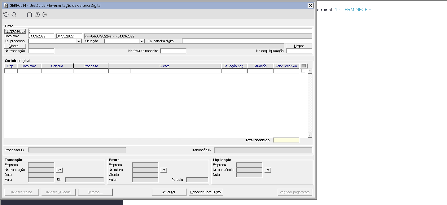 Imagem 5 - Após o cliente realizar o pagamento do PIX e o usuário ao acessar o GERFC014 (Gestão movimentação de carteira digital) e realizar a consulta pelo botão "Verificar pagamento", será baixado as faturas e movimentado o conta corrente.