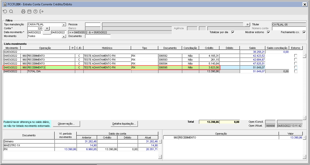 Imagem 7 - Demonstração da movimentação do conta corrente na conta do caixa filial.