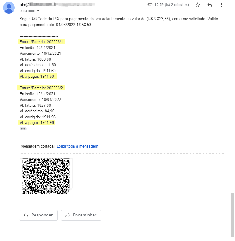 Imagem 3 - Imagem do e-mail enviado com os dados das faturas e o QRCode do PIX.