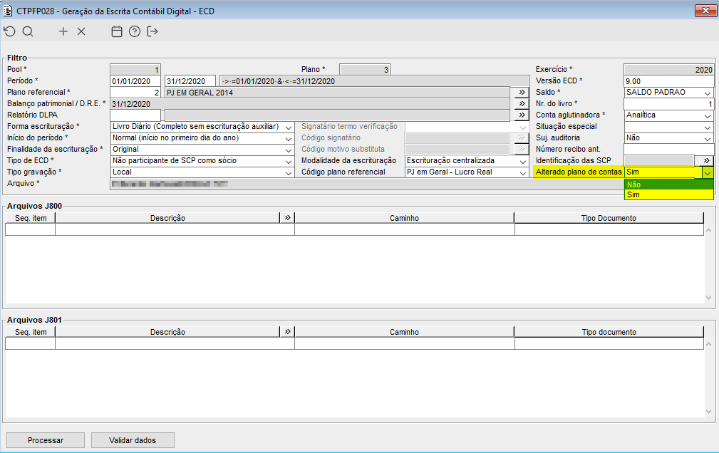 Imagem 1 - Ao gerar a ECD existe a opção para gerar "Alterado o plano de contas" com os valores "Sim" ou "Não".