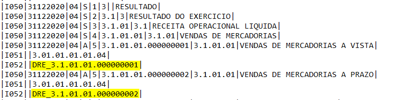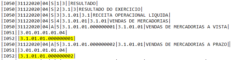 Imagem 4 - Acima vemos a ECD gerada com a opção "Sim" no "Alterado plano de contas" para o registro I052.