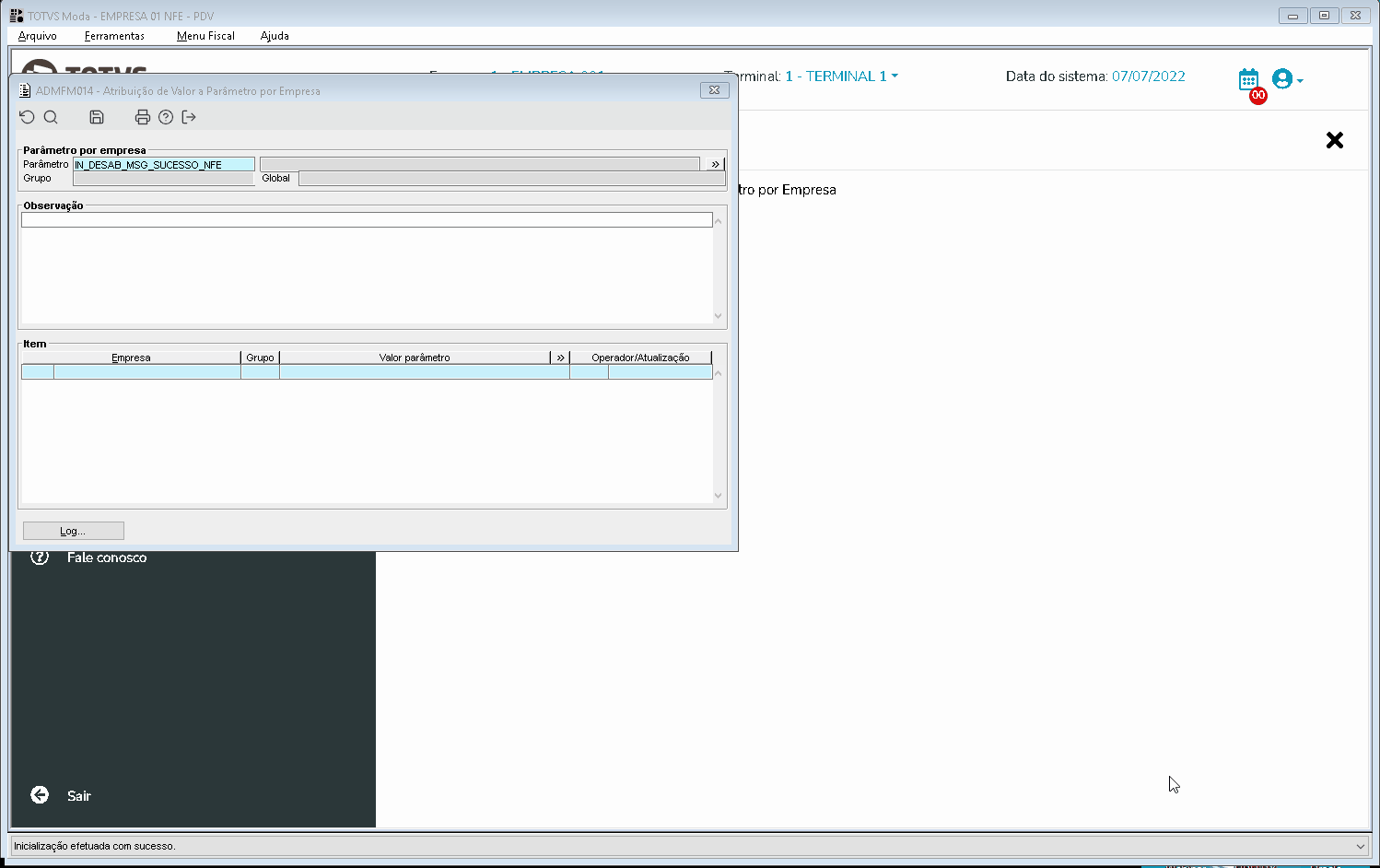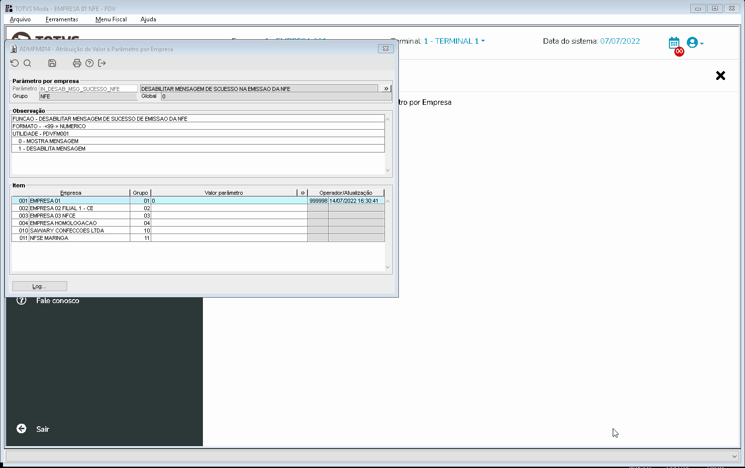 Criado o parâmetro empresa IN_DESAB_MSG_SUCESSO_NFE para apresentar ou não a mensagem "NF enviada com sucesso!" ao enviar uma nota fiscal eletrônica para a Sefaz.