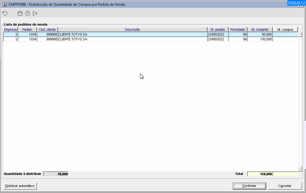 | Função: | Distribuir as quantidades do pedido de compra para os pedidos de venda selecionados |