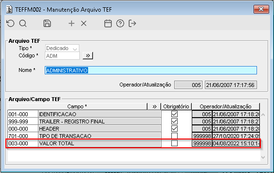 Observação: Se o parâmetro estiver configurado, porém na configuração do componente TEFFM002 não possuir o campo 003-000 configurado, o valor não é enviado. Ou seja para que o valor seja enviado, o campo 003-000 deve estar configurado no TEFFM002 e o parâmetro também deve estar configurado, conforme demonstrado nas imagens 1 e 2.