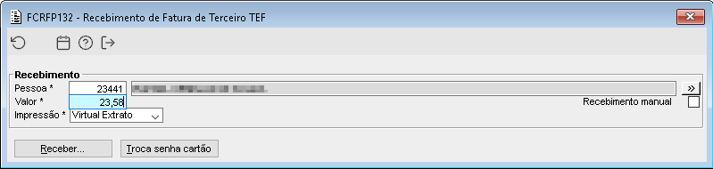Solicitada a possibilidade de enviar o valor no recebimento de fatura de terceiro pelo componente FCRFP132, para o SITEF.