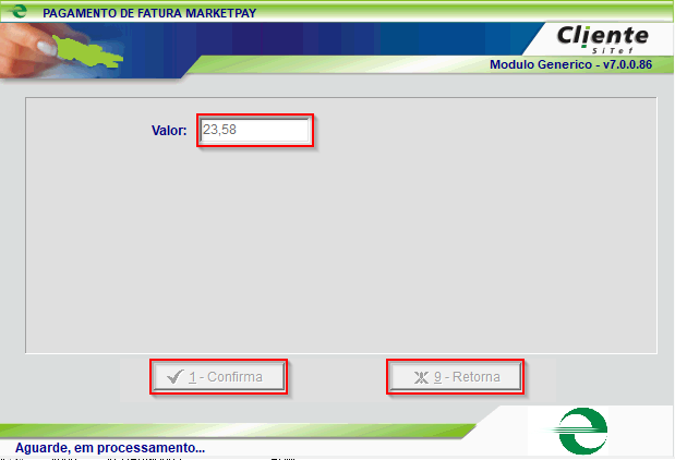 Imagem 5 - Demonstra o SITEF já na parte de valor para pagamento de fatura MarketPay, com o campo de "Valor" e os botões "1 - Confirma" e o "9 - Retorna" bloqueados para ação do usuário e já realizando o processamento, pois o valor foi recebido do sistema TOTVS Moda.