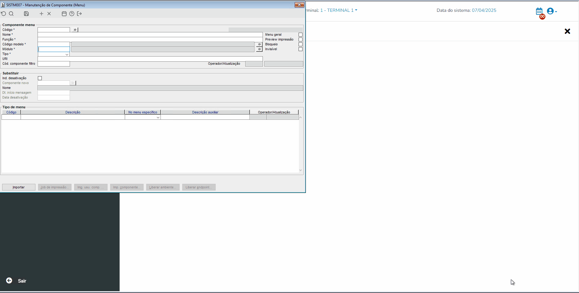 Ao cadastrar um novo componente através do SISTM007 será validado ao sair do componente se está liberado para um dos seguintes menus: BackOffice, Manufatura, Retaguarda, PDV, Pré-venda, Coletor e Consulta.