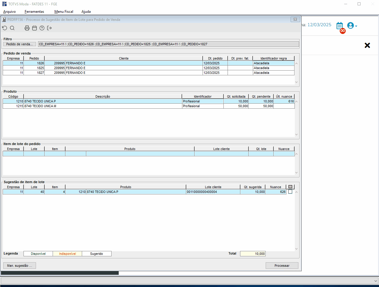 Foi solicitado que no PEDFP156 permita filtrar mais de um pedido de venda para sugestão de item de lote.