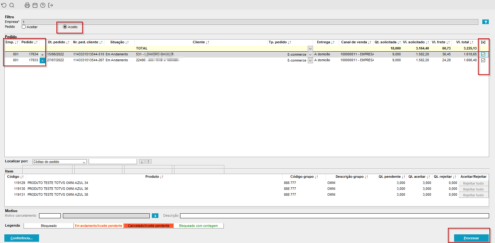 Imagem 01 - Demonstra a disponibilidade de processamento para pedidos já aceitos, na sequência será realizado processamento do faturamento do pedidos selecionados.