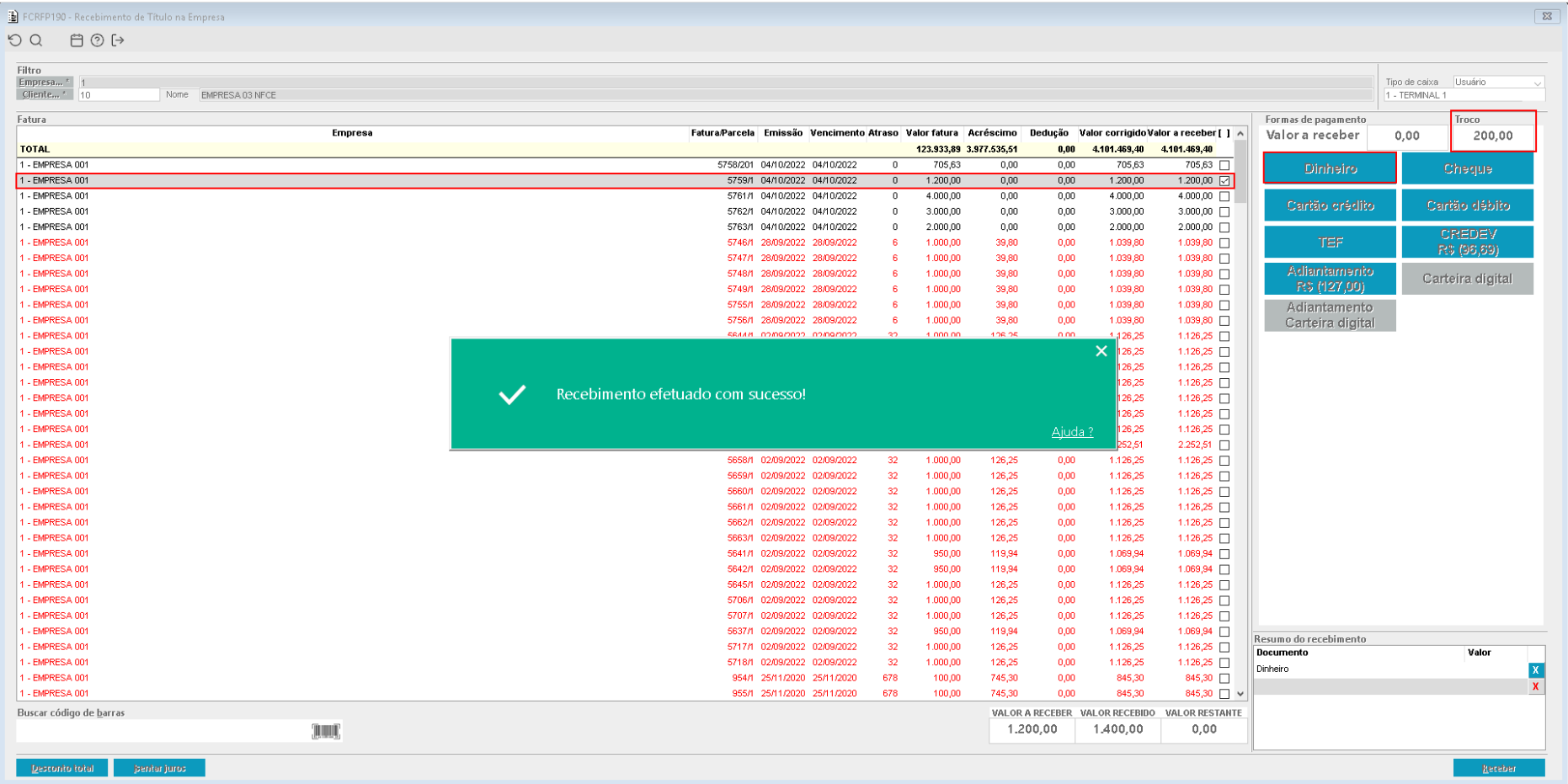 Imagem 3 - Recebimento efetuado em Dinheiro com Troco.