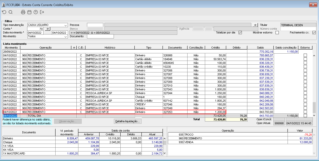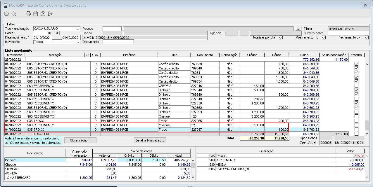 Imagem 9 - Exemplo de movimentação na conta de caixa usuário utilizada do recebimento com o documento Dinheiro e Cheque, possuindo Troco, demonstrando apenas o Cheque e o Dinheiro.