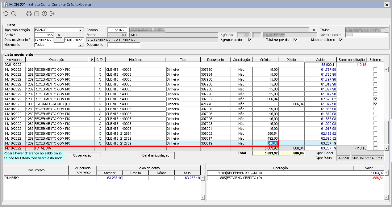 Imagem 6 - Demonstração da movimentação do recebimento em PIX já baixado, na conta de banco vinculado ao documento PIX no GERFL039.