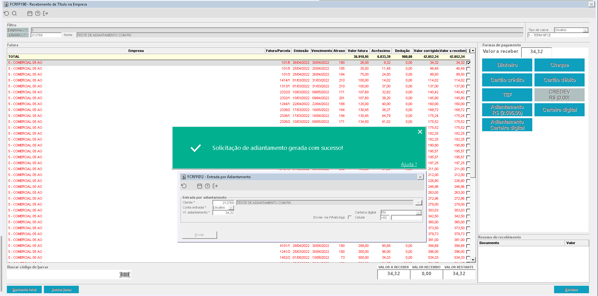 Imagem 1 -  Demonstração do recebimento total efetuado em Adiantamento.