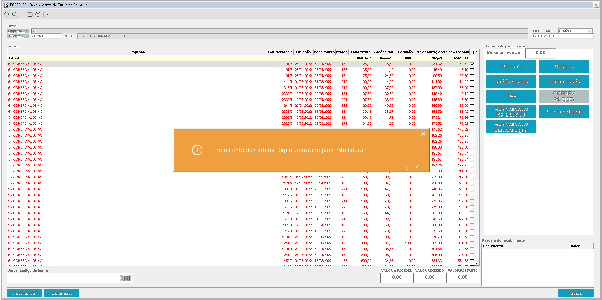 Recebimento realizado via Carteira Digital em PIX, com o parâmetro IN_GERA_PIX_ABERTO com o valor 1, ou seja, para realizar a geração da fatura do PIX em aberto.