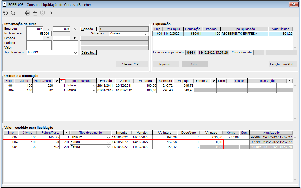 Imagem 2 - No componente FCRFC076, temos o detalhamento da liquidação gerada, em destaque o desconto aplicado na fatura.