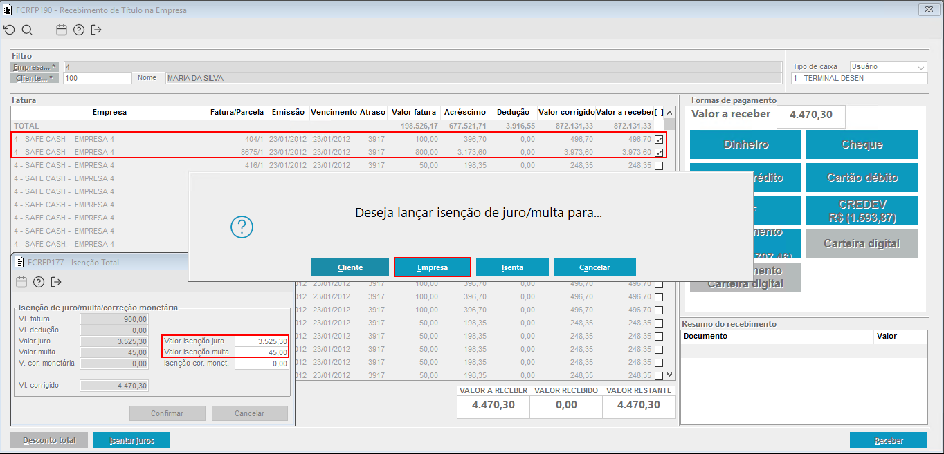 A isenção dos juros/multas poderá ser feita de 3 maneiras, sendo para o Cliente, Empresa ou Isenta.