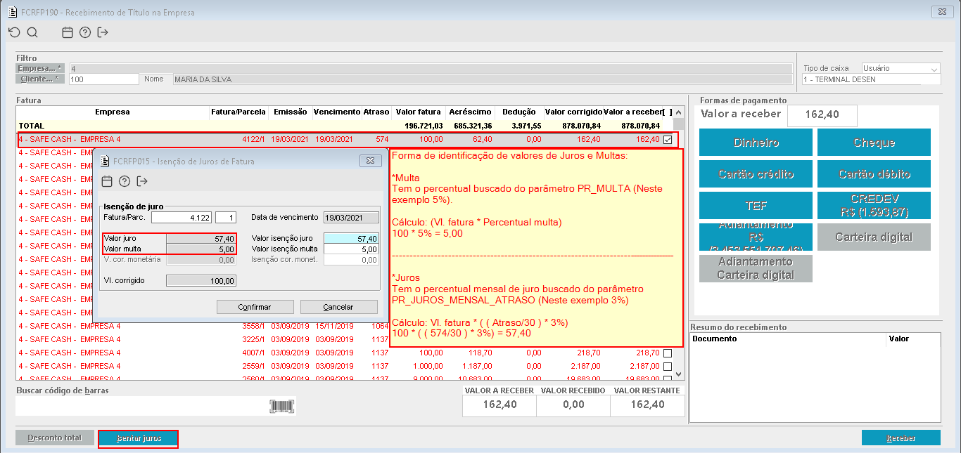 No botão Isentar juros é possível realizar o abatimento total ou parcial dos juros/multas incidentes de fatura em fatura que está em foco (Parâmetro TP_ISENCAO_ACRESCIMOS configurado com o valor 0)  ou sobre a somatória total de todas as faturas selecionadas (Parâmetro TP_ISENCAO_ACRESCIMOS configurado com o valor 1), no qual o recebimento estará sendo realizado.