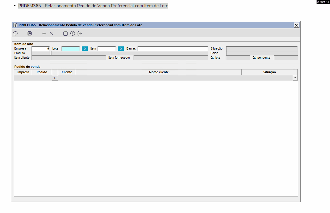 | Função: | PRDFM365 - Relacionamento Pedido de Venda Preferencial com Item de Lote |