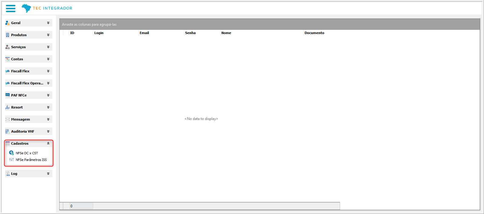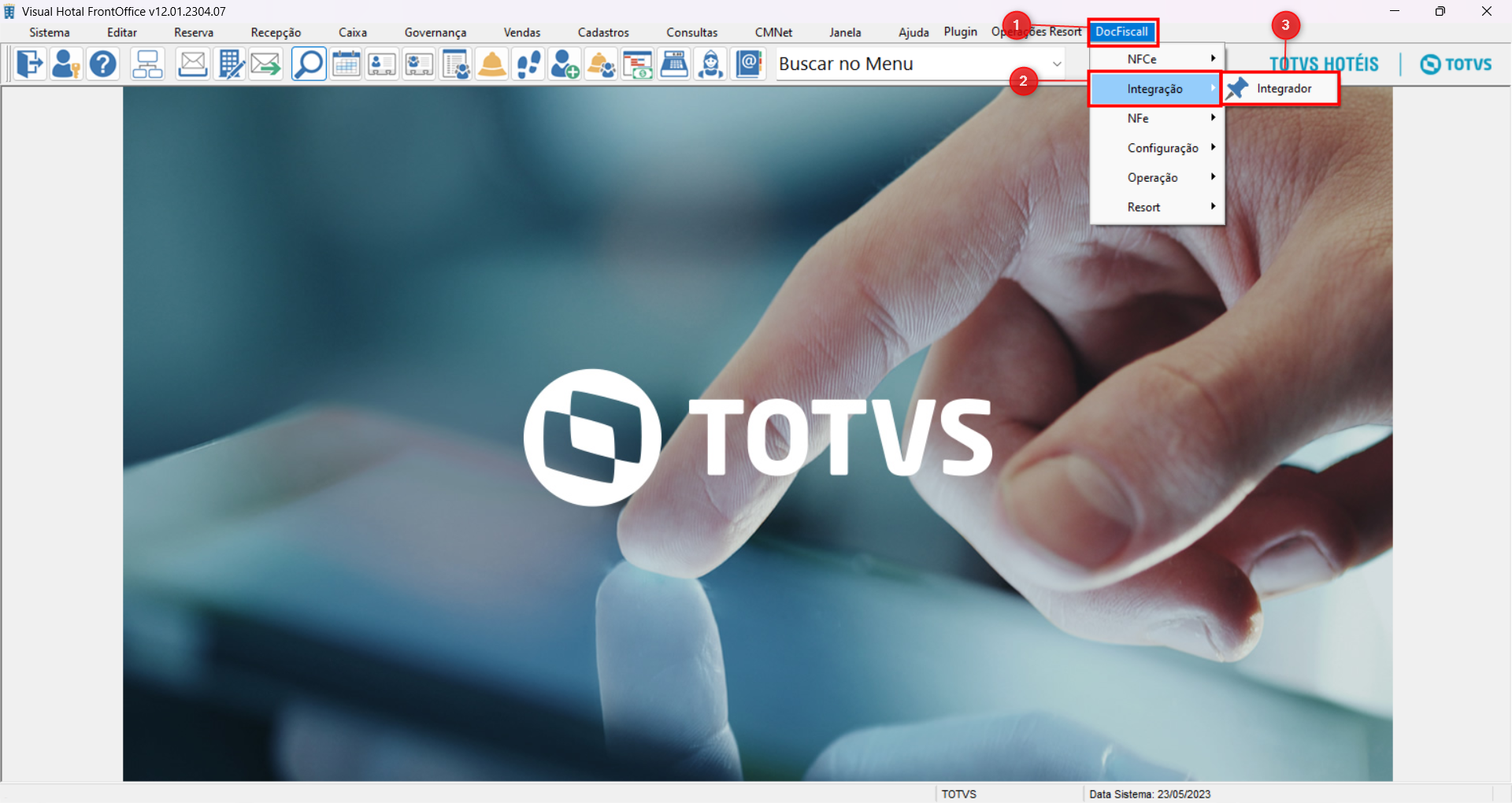 - (1) Menu “DocFiscall” > (2) Submenu “Integração” > (3) Selecionar opção “Integrador”.