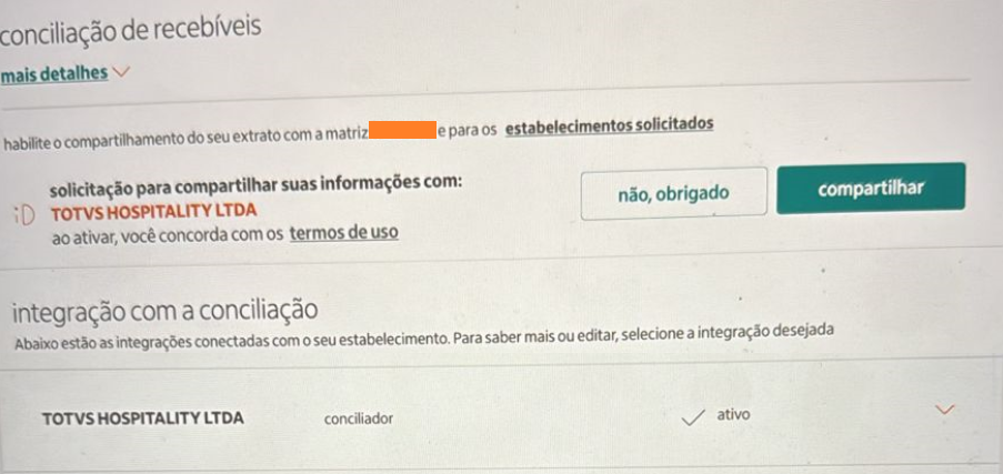No ícone representado por um sino, haverá a indicação de notificação. solicitando o compartilhamento para a Conciliadora Totvs Hospitality Ltda., onde o usuário MASTER cadastrado na Rede, deverá realizar a aprovação, aceitando o compartilhamento, como sugerem as imagens abaixo.