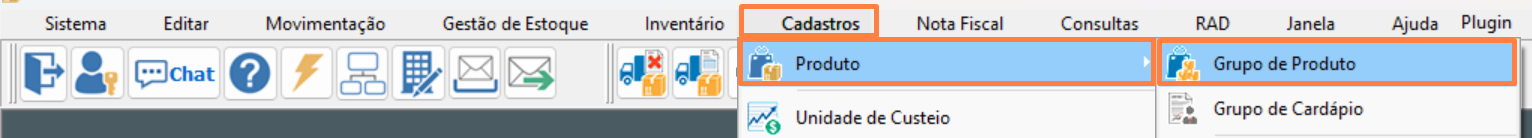 5 - Para incluir as informações da reforma tributária no grupo de produtos, acessa a guia Cadastros, Produto e Grupo de Produto;