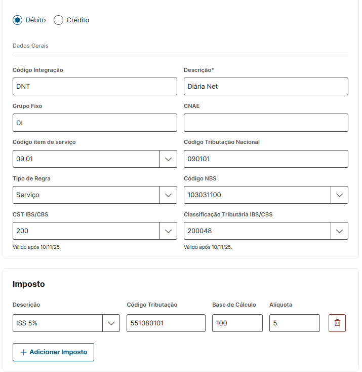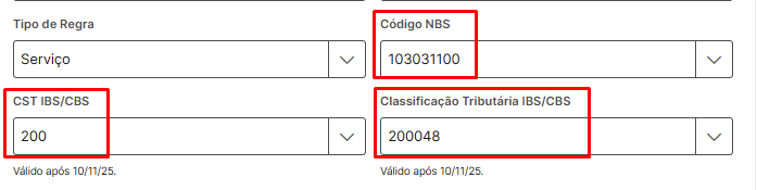 (informação) Os campos Código NBS, CST IBS/CBS e Classificação Tributária IBS/CBS precisam ter códigos coerentes, de acordo com a tabela da NFS-e Nacional.