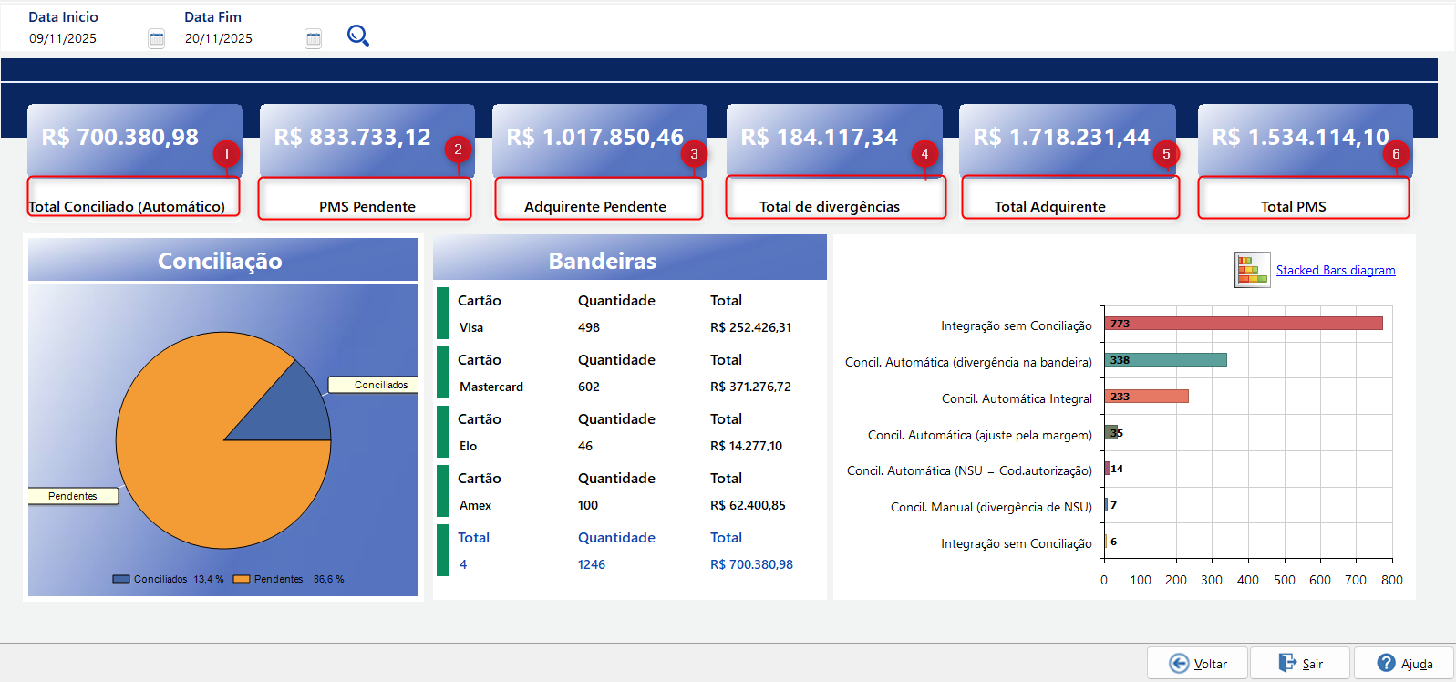 E na meio da tela são exibidos gráficos e resumos dos recebimentos conciliados, agrupamento por Bandeira e os status de conciliação por tipo de operação: