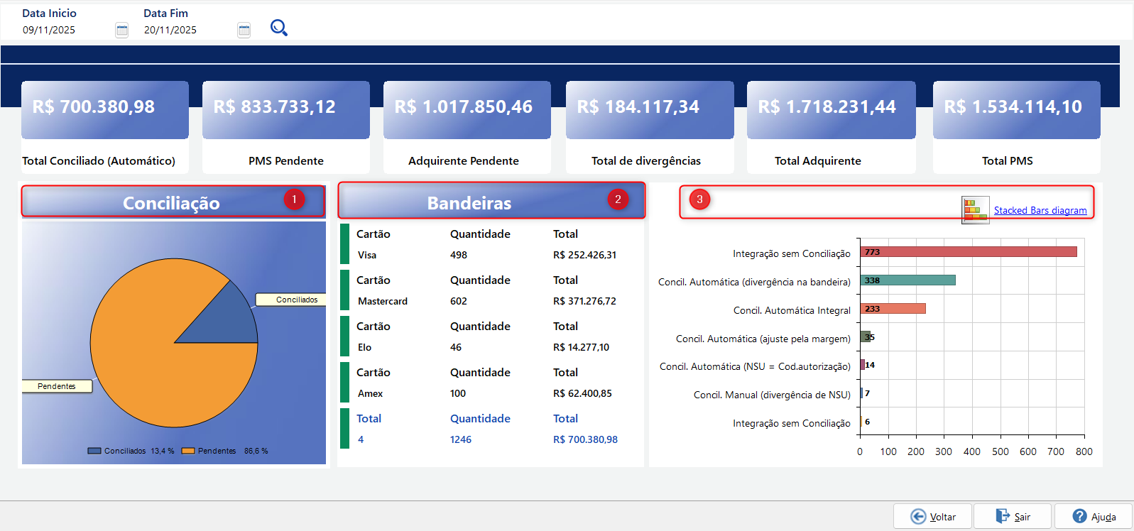 No menu Dashboard, será exibido o painel de controle com os dados estatísticos específicos sobre a conciliação das vendas.