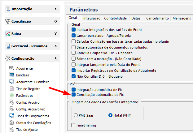 Desmarcar a opção de Conciliação Automática de PIX