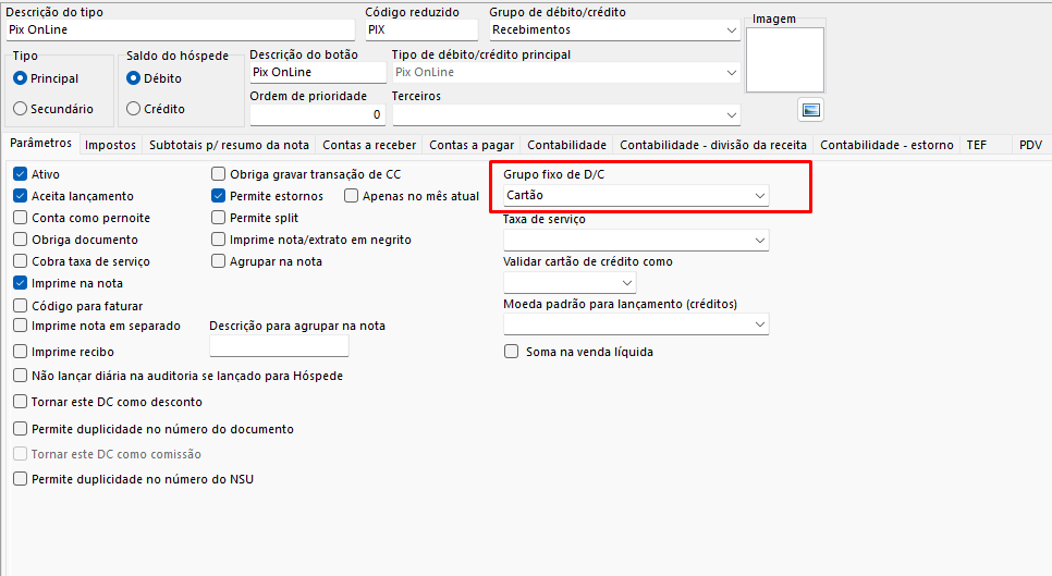- Configuração do Tipo de Debito e Crédito