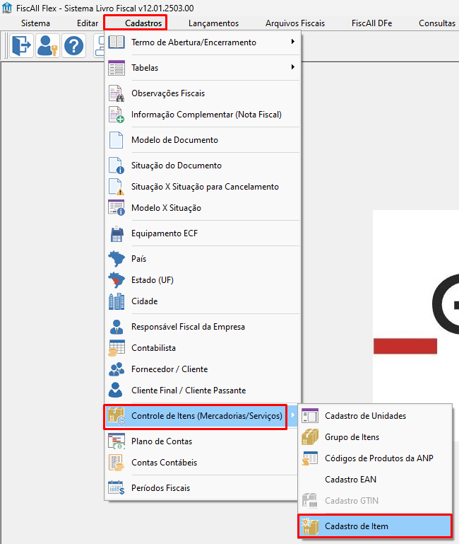 As informações fiscais dos itens, como CFOP, CST e Regime de Apuração de PIS/COFINS são considerados do Cadastro de Itens do FiscAll Flex, acessado neste caminho: