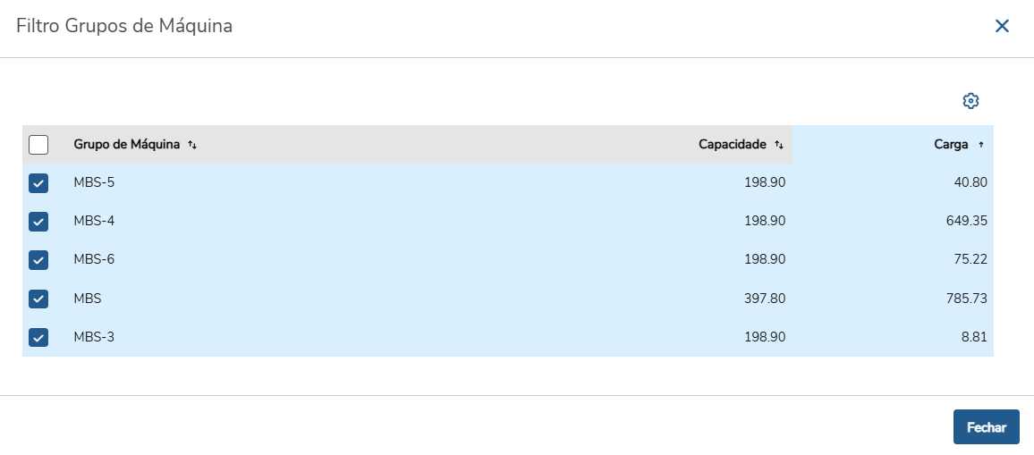 O programa foi ajustado para aplicar ordenação numérica na coluna 'Carga' e 'Capacidade', permitindo a visualização dos Grupos de Máquina em ordem decrescente ou crescente.
