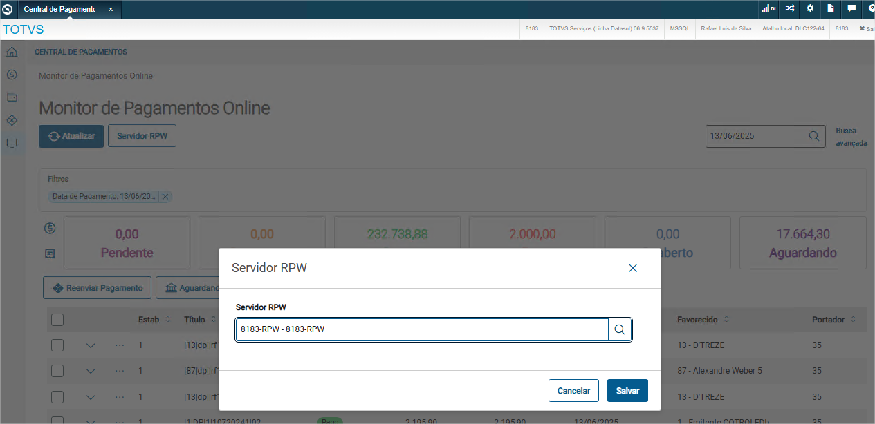 Por meio deste botão, é possível definir o servidor RPW responsável pelo processamento do envio ao banco. Ao selecionar o botão de zoom, será exibida uma tela com todos os servidores disponíveis para processamento, sendo necessário selecionar um deles.