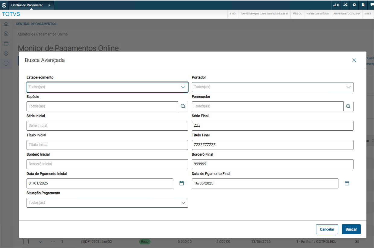 | Data de Pagamento Inicial / Final | Pode ser informado, por meio de uma faixa, a Data do Pagamento Online. |