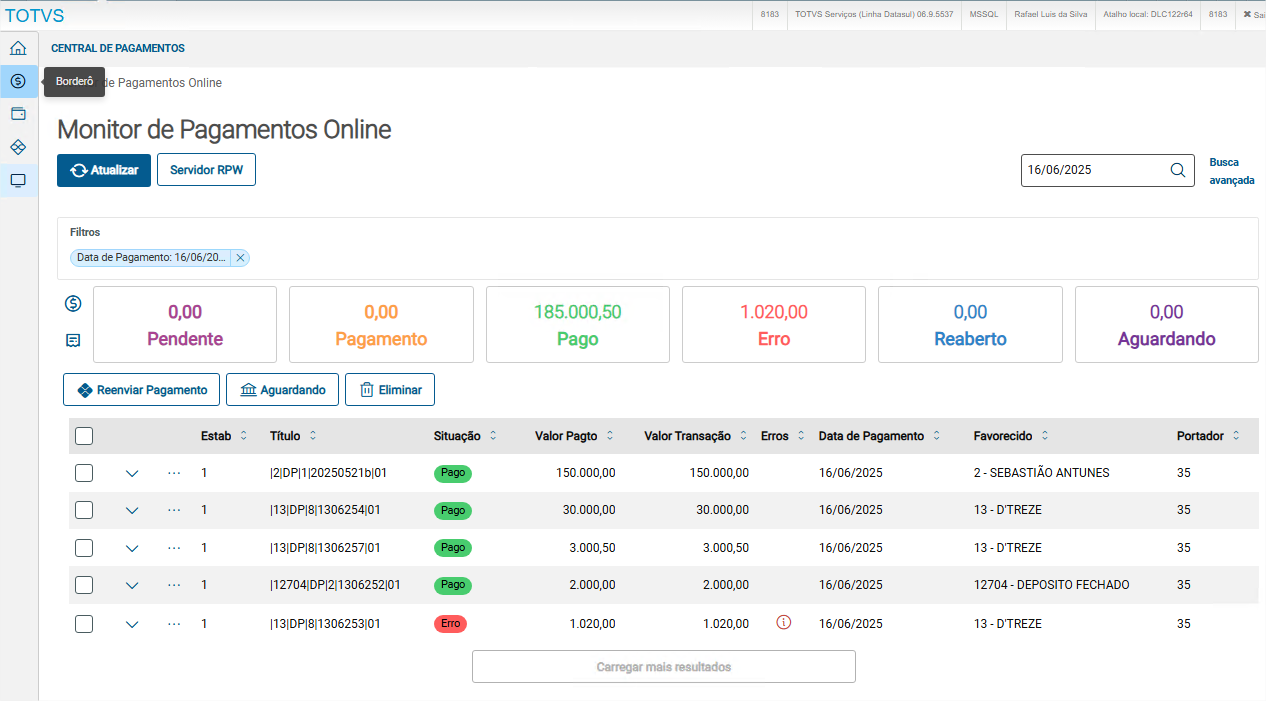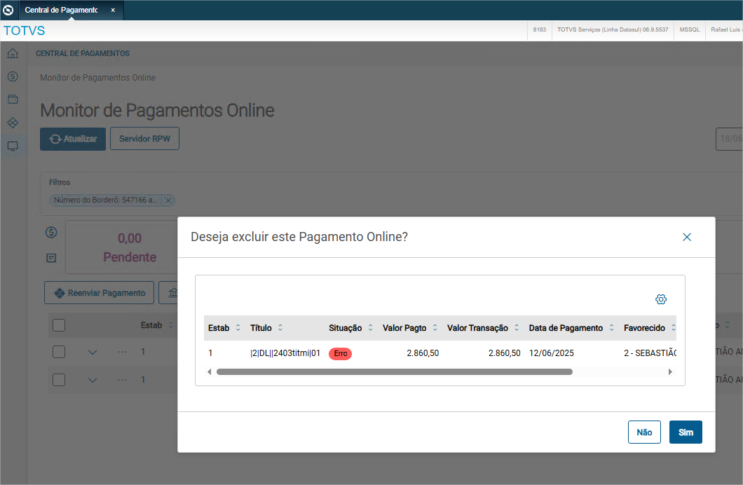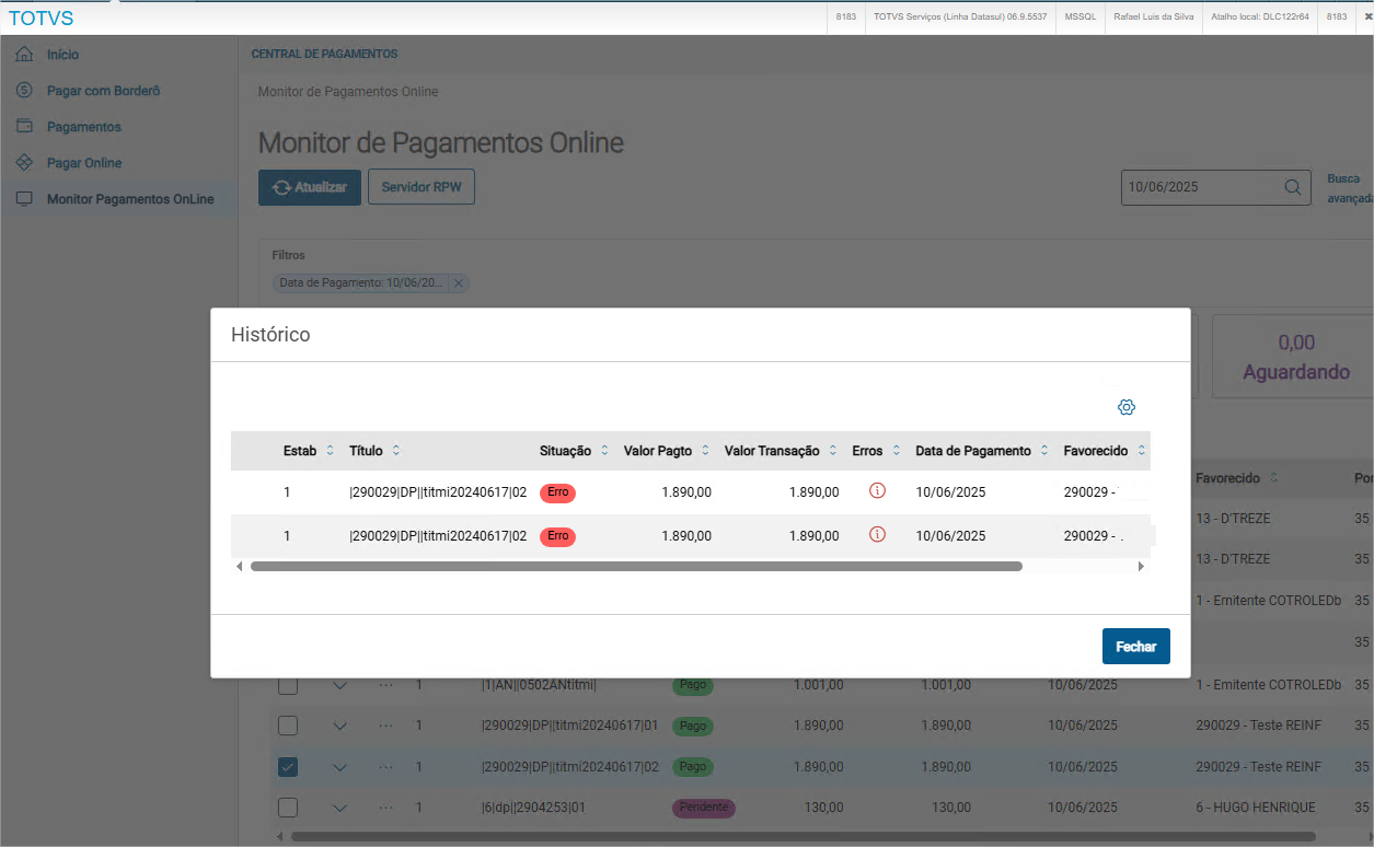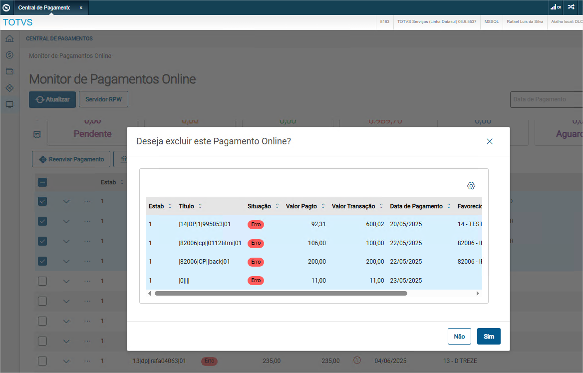 Essa opção estará habilitada somente quando a situação do pagamento for "Erro".