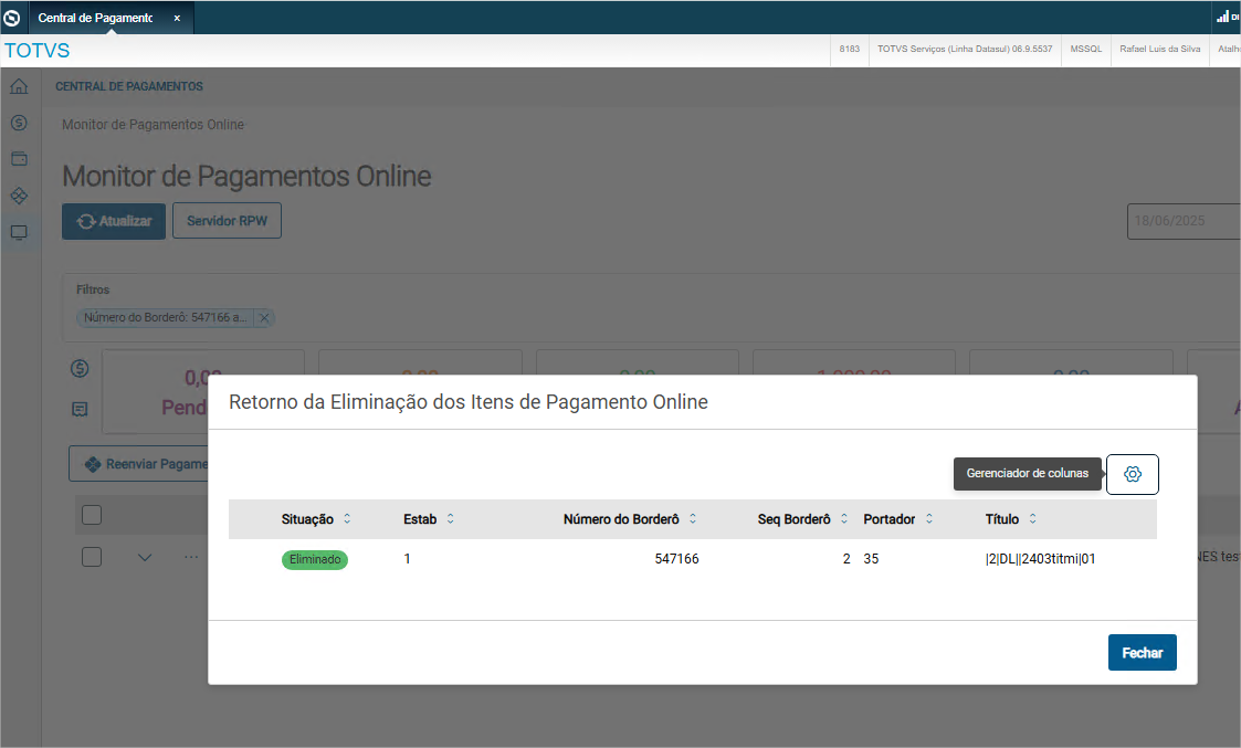 A rotina do Monitor de Pagamentos Online permite a execução de ações em lote, aplicáveis a mais de um item da tabela simultaneamente.