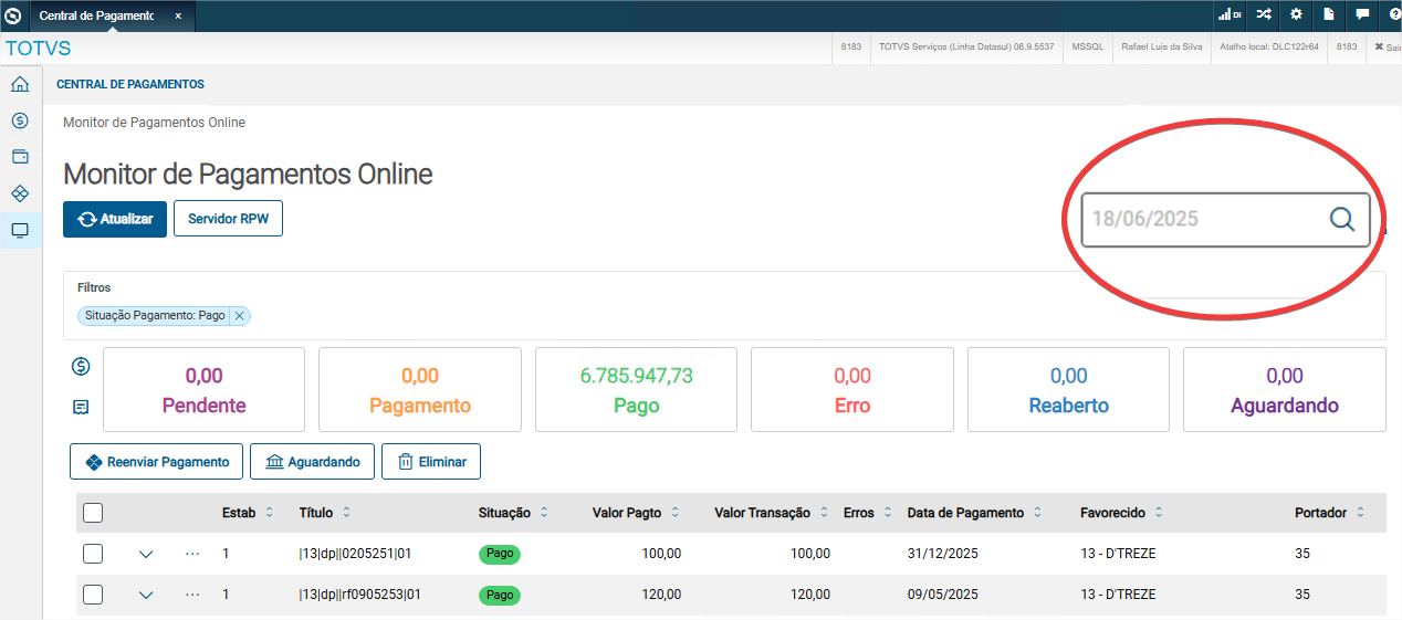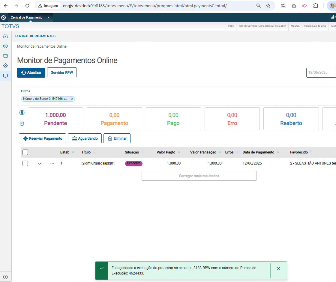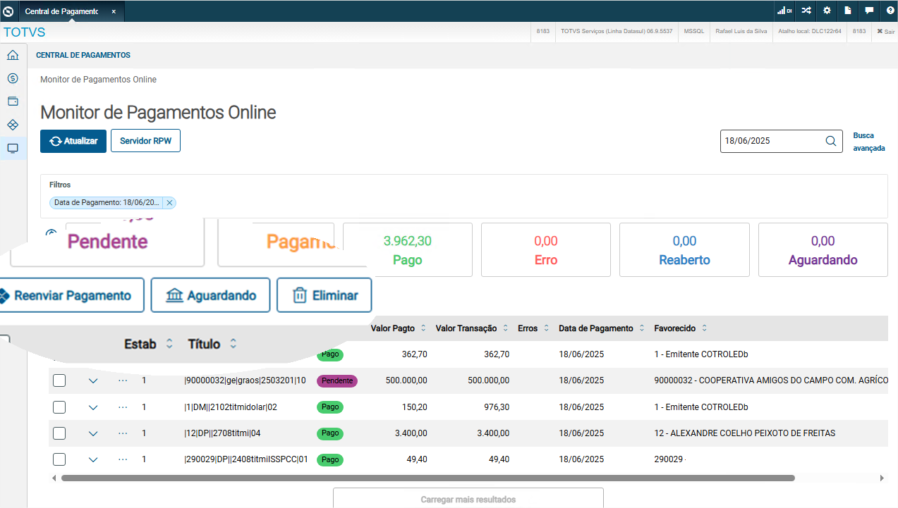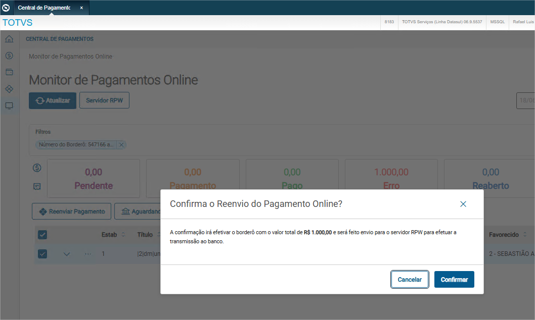 A ação Reenviar Pagamento permite realizar um novo envio do pagamento ao banco.
