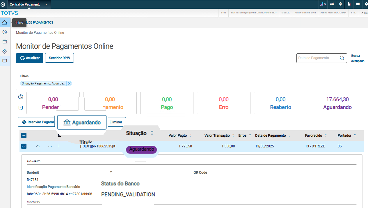 Quando um pagamento é enviado ou reenviado ao banco, há um prazo para que o banco retorne com o status atualizado do título. Caso esse retorno não ocorra dentro do tempo esperado, o sistema mantém o título com a situação "Aguardando" e no Pagamento (visualizado por meio da expansão), o campo Status do Banco permanece como "PENDING_VALIDATION".