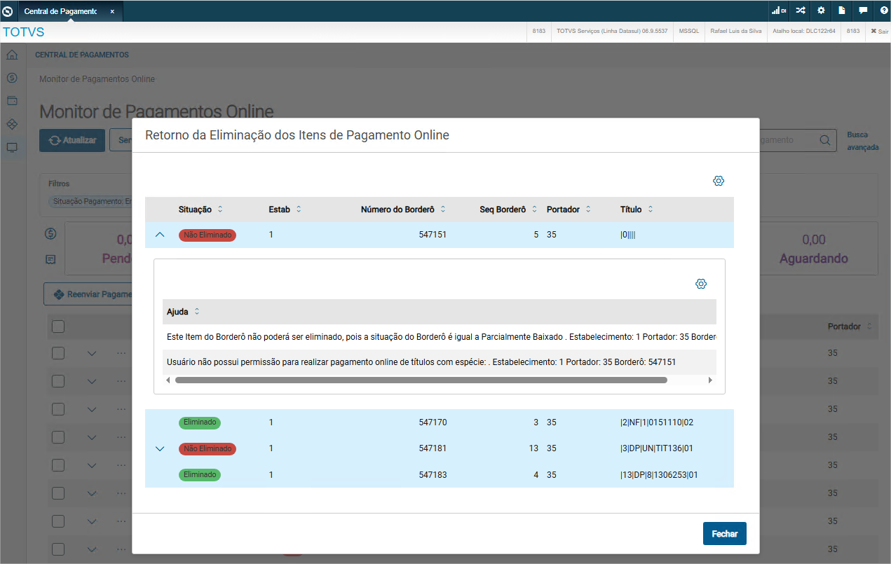Após a confirmação, o sistema apresentará uma tela de retorno, informando se os pagamentos foram eliminados com sucesso ou não eliminados, nos casos em que houver alguma inconsistência que impeça a exclusão.