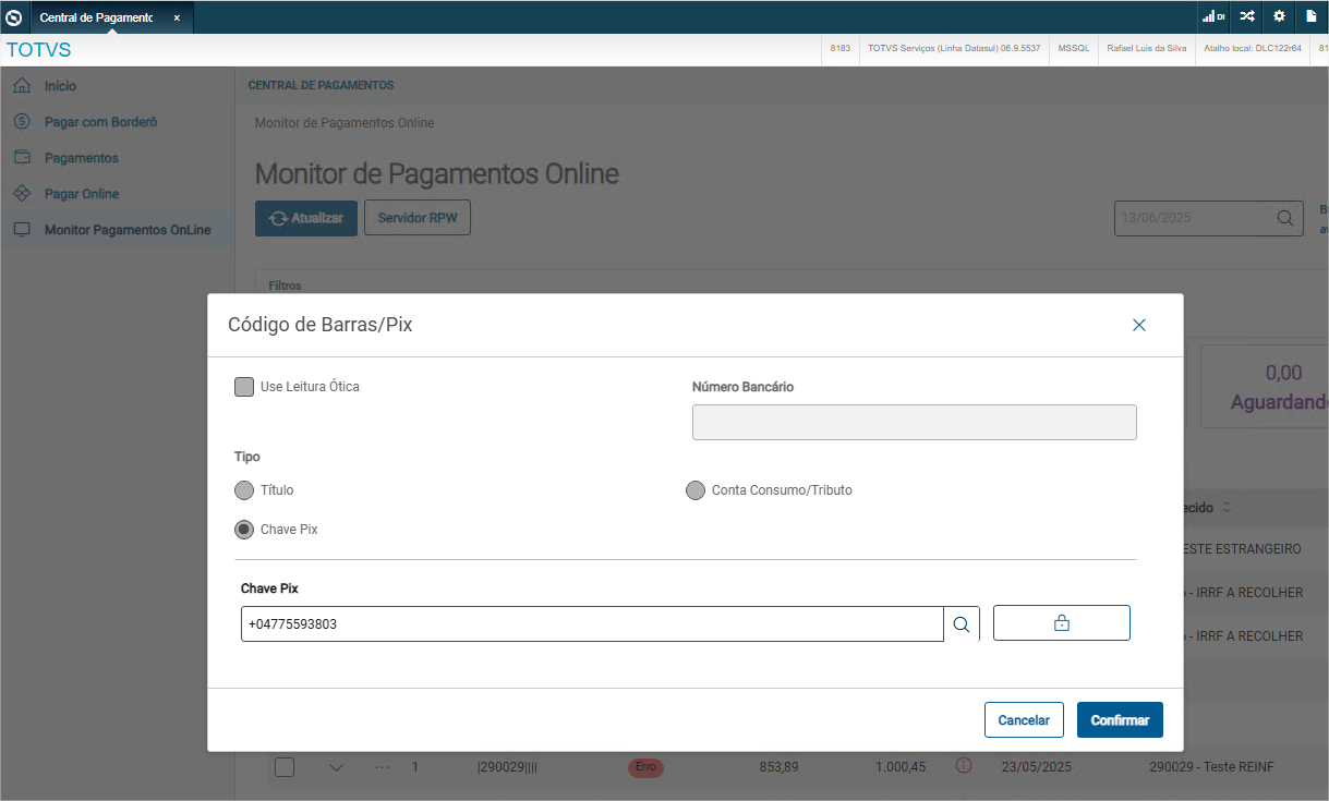 Para realizar a alteração, a nova chave Pix deverá estar previamente cadastrada no fornecedor, já que será necessário informar tanto a chave quanto o tipo correspondente.