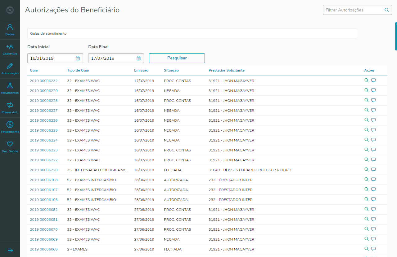 Este programa permite visualizar as guias de atendimento associadas aos beneficiários ativos da pessoa.