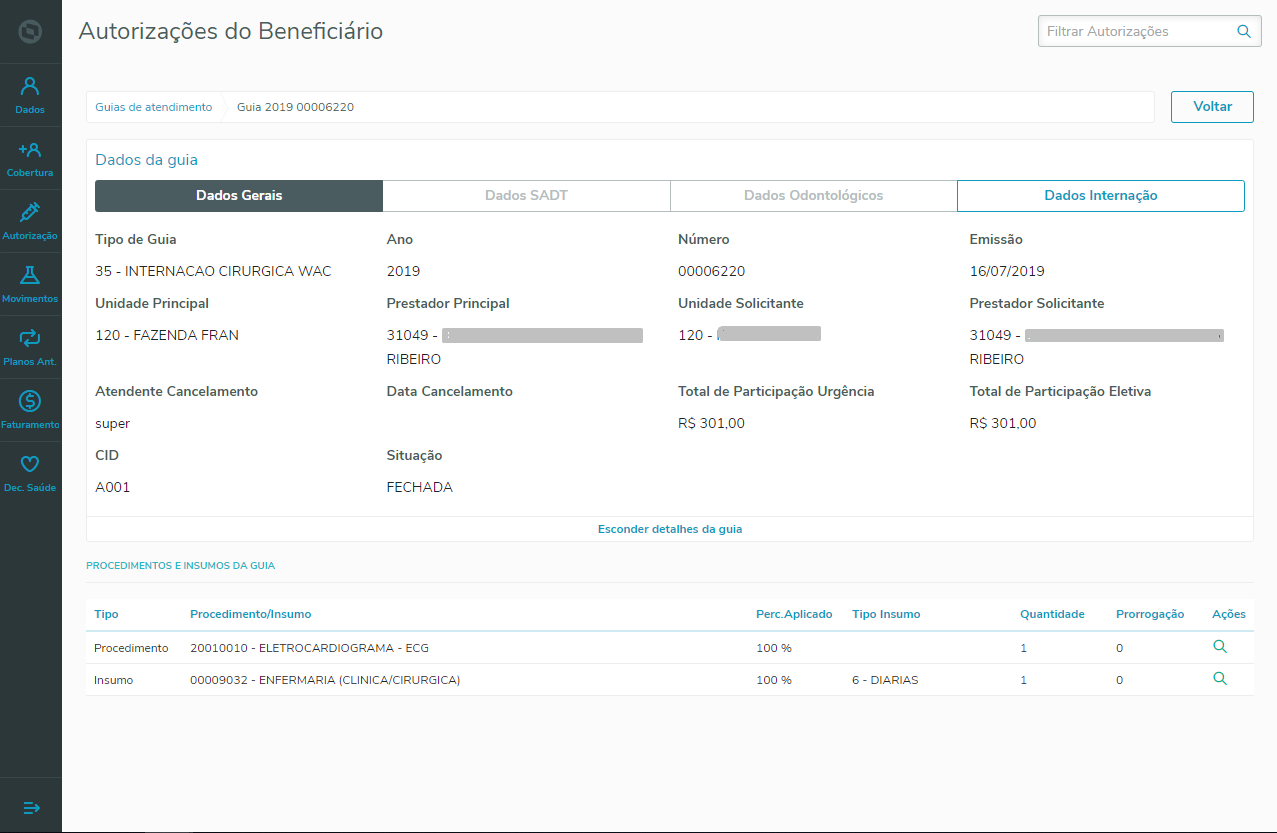 A tela de detalhes da guia, permite visualizar os dados (Gerais, SADT, Odontológicos ou Interação), o tipo da guia, e os seus movimentos.