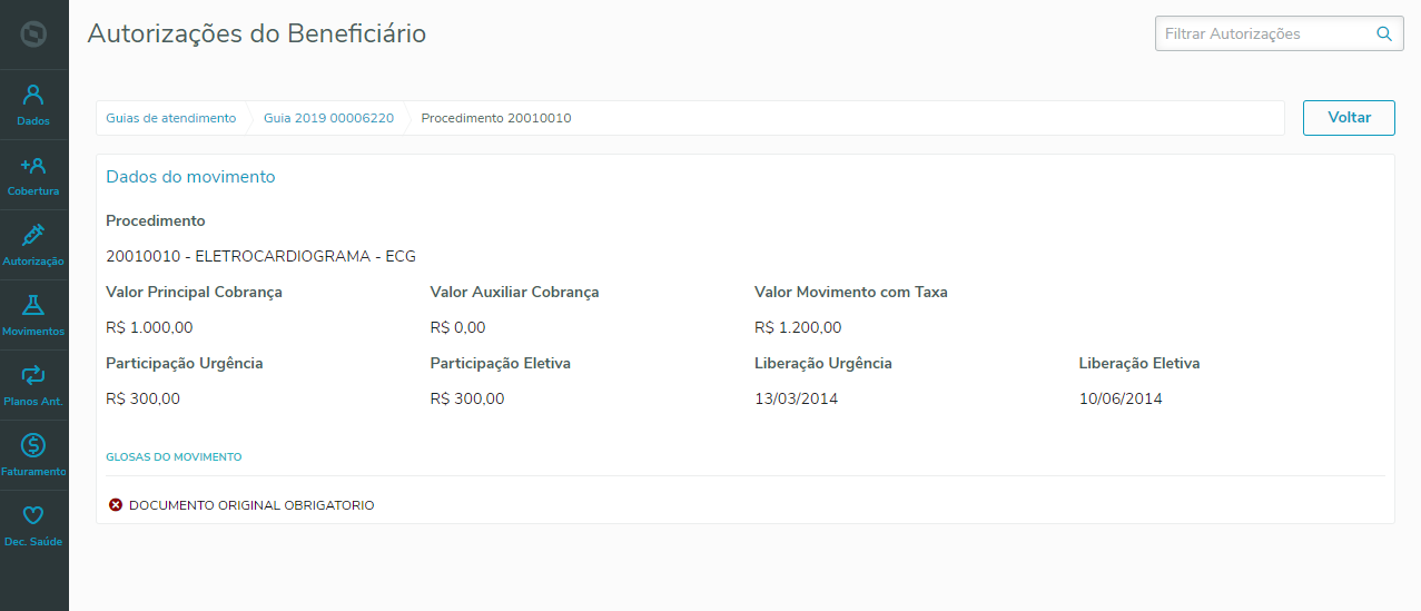 A tela de detalhes do movimento, apresenta os valores do procedimento ou insumo selecionados, além da participação, data de liberação e glosas.