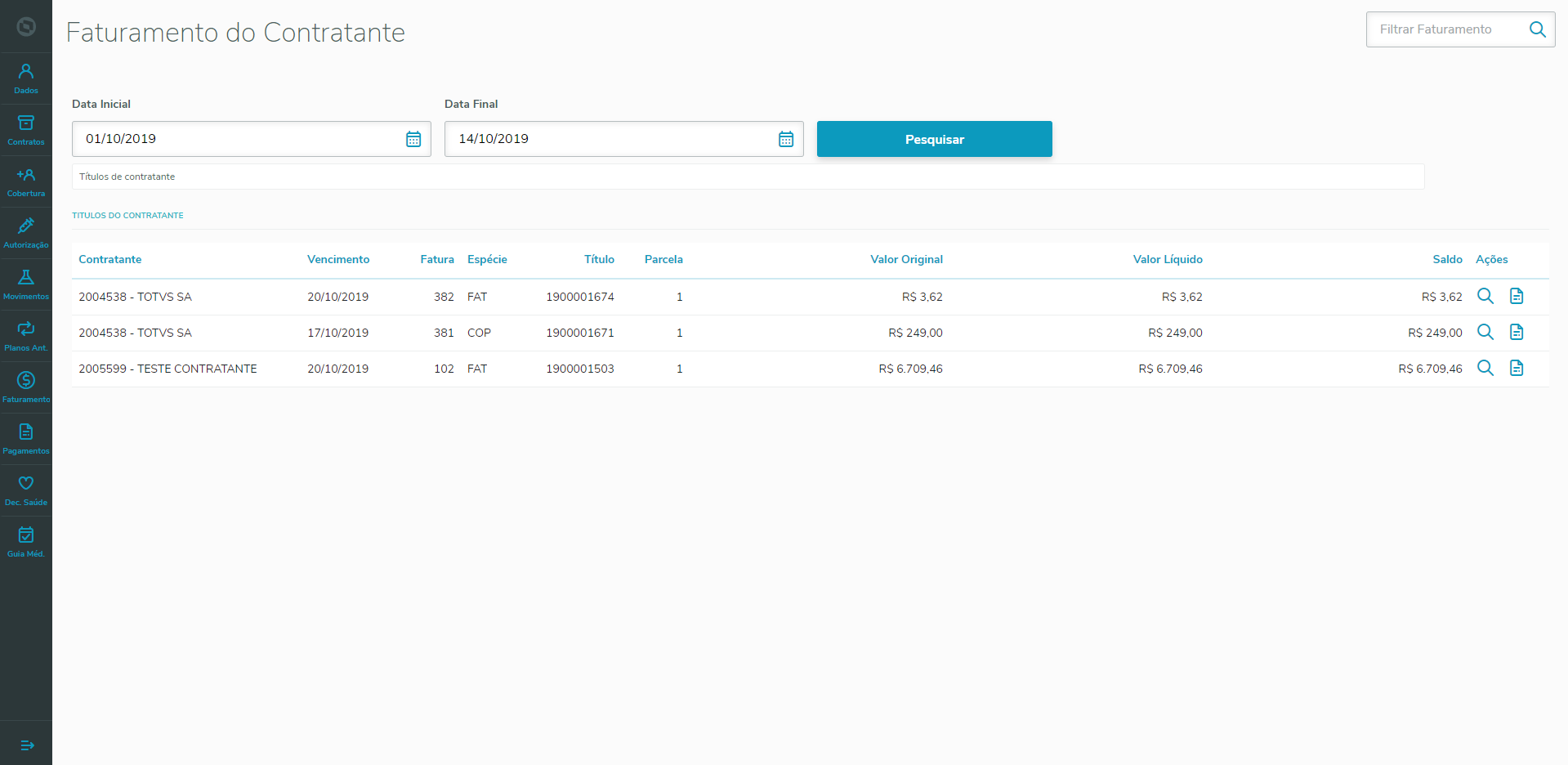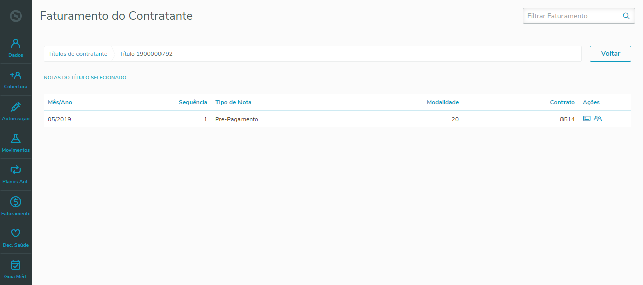 Permite visualizar o faturamento de beneficiários e contratantes, apresentando os títulos de faturamento dos contratantes relacionados aos beneficiários ativos da pessoa pesquisada. Caso o beneficiário esteja em mais de um contrato ativo e com contratantes diferentes, serão apresentados os títulos de todos os contratantes.
