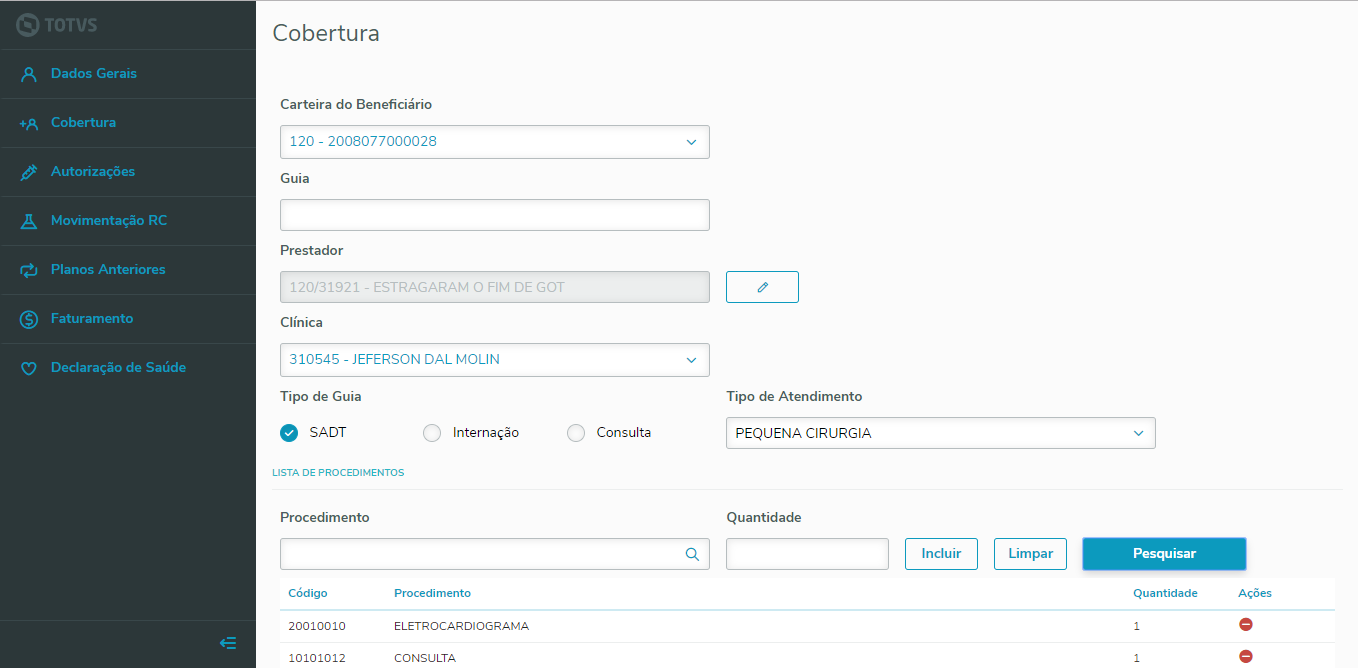 • Tipo de Guia - volta para opção "SADT"