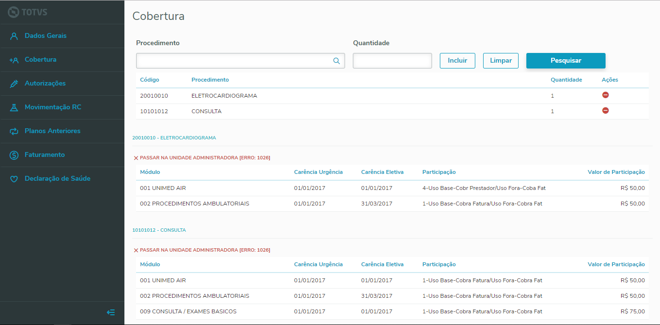 Este programa permite visualizar a cobertura que os beneficiários ativos da pessoa possuem junto com os valores simulados de participação.