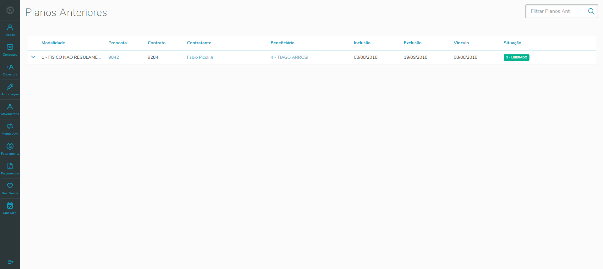 Este programa permite visualizar os beneficiários em planos anteriores em relação aos beneficiários ativos apresentados na visão de "Dados Gerais". Ao clicar sobre a proposta, beneficiário ou contratante apresentados, serão exibidos os detalhes respectivos de cada cadastro.