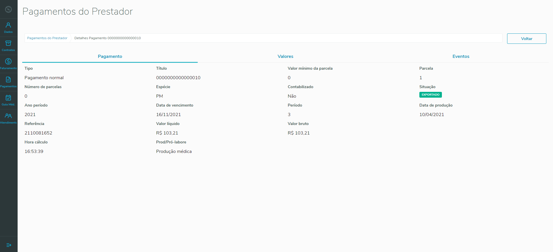 A tela de detalhes do pagamento do prestador permite visualizar as informações do pagamento, valores e eventos.